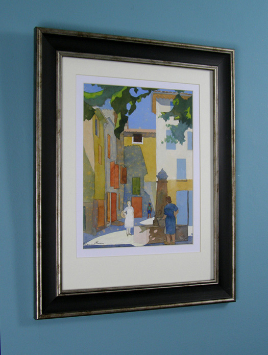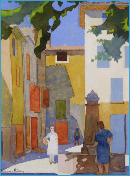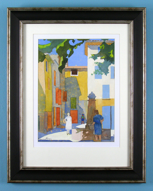 A watercolour by French artist Rosamond Plisson depicting a village pump in a rural village square with two women chatting in the dappled sunshine beneath a large tree. Probably done during the period when Plisson was working on the book `Provinces of France - Customs and costumes` in the 1940`s (see below). Double Ingres mount and contemporary black/gilt frame.