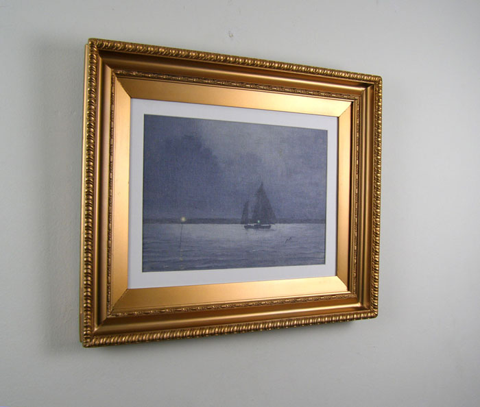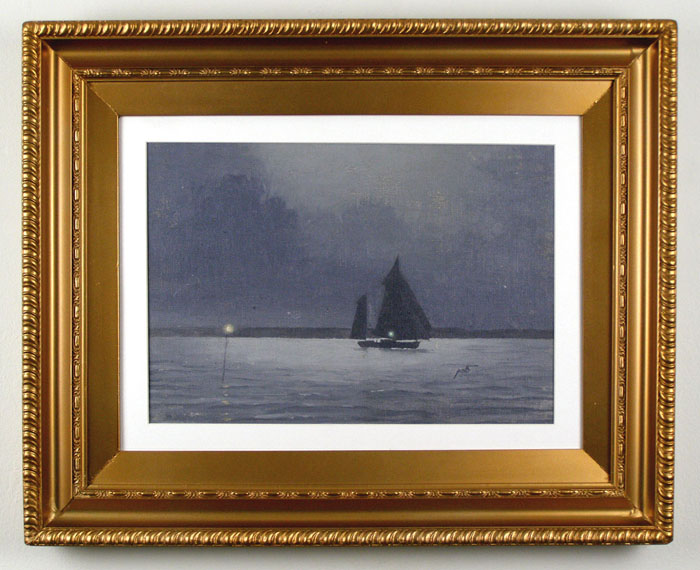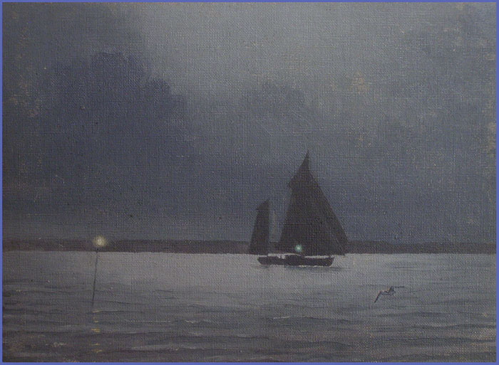 A rare and wonderfully atmospheric oil by W.J.Fletcher which appears to show a sailing vessel leaving on the evening tide. Fletcher was a Colchester artist so this is likely to be the Essex coast, perhaps the Colne estuary near Wivenhoe. Only after acquiring the painting (as an unsigned work) did I find a signature verso, as well as some strange writing `Mr.Fletcher, RA mess`. `Johnson and Greutzner` give Fletchers address as RA Mess, Colchester, so not the Royal Academy but the Royal Artillery! I can find no reference later on to this artist- one wonders if he survived the war, would be an interesting research project. The painting is housed in a very nice classic ornate gilt frame with only a few minor faults - suits this very subtle painting.