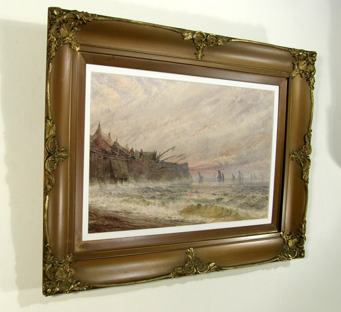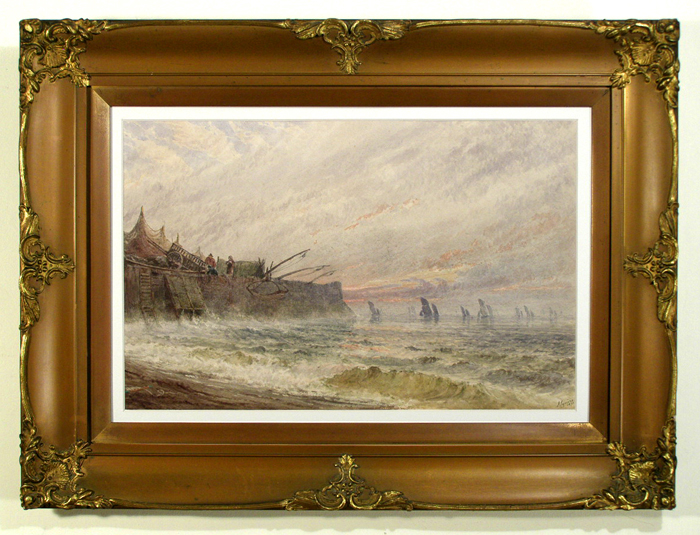 Lovely Victorian watercolour by John Squire depicting the return of the fishing fleet, with the folk on the shore waiting to unload the catch. Very finely painted with subtle misty `mother of pearl` colours in the sky and sea. This is almost definitely a Cornish location, probably Newlyn. Fabulous ornate swept gilded frame in great condition and with a nice original patina. Glazed and ready to hang.