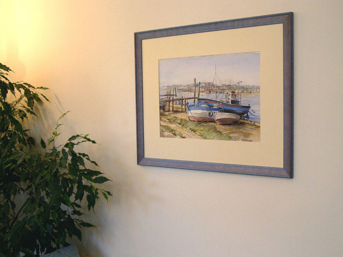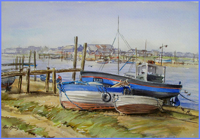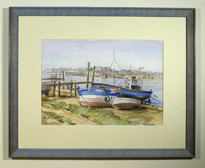 A lovely large and fresh watercolour depicting a scene at low tide in Walberswick, Suffolk. Work by Ron Briggs does come up for auction occasionally, but at present I am still researching this talented artist. Very nice reeded grey frame and ivory mount.