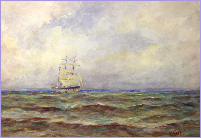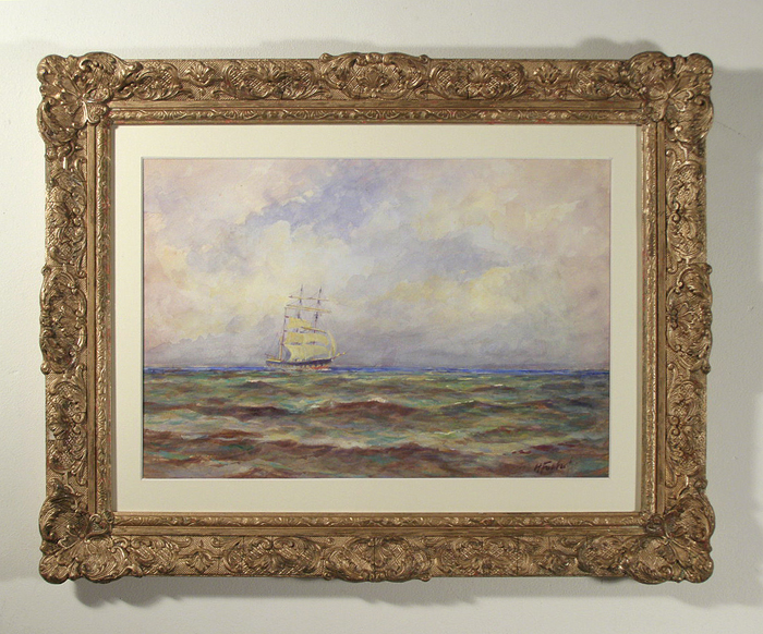A fine maritime watercolour depicting a square rigger running before the wind on a choppy sea. Nicely painted with the sun glinting off the sails and rigging. Maritime artist H .Foster is a bit of a mystery - the work is of high quality but information is hard to come by. I have only been able to find one other example painted in 1919 and valued by Sothebys at £800-1200. It would appear that Foster was painting in the early years of the 20th century. The painting is housed in an excellent ornate gilt frame and is glazed and ready to hang. Excellent condition with no foxing or fading.
