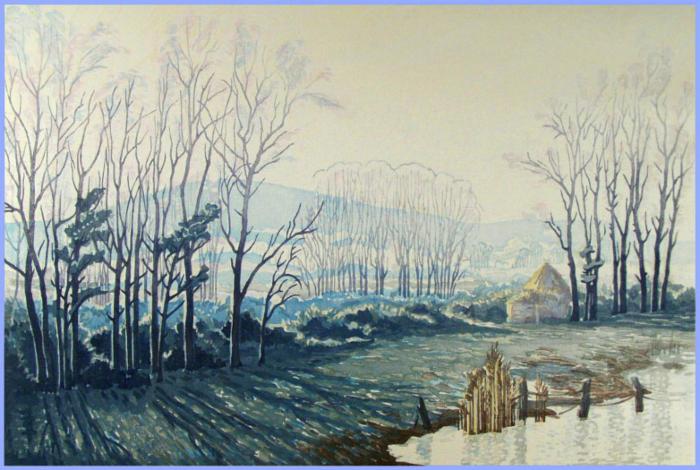 A RARE and highly collectable woodblock print by the Morton twins dating to 1933. The image is a famous one `Spring Rhapsody`- a print was purchased by the Contemporary Art Society for the print room of the British Museum back in the 1930`s. The view is actually a scene in the Isle of Wight, most of their woodblock prints depict this area, and is reputedly `looking towards Brading from Bembridge harbour. Signed in pencil by both brothers, and numbered and dated, I think this would have been from an early edition.