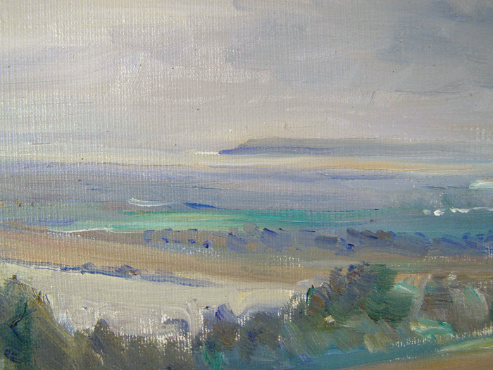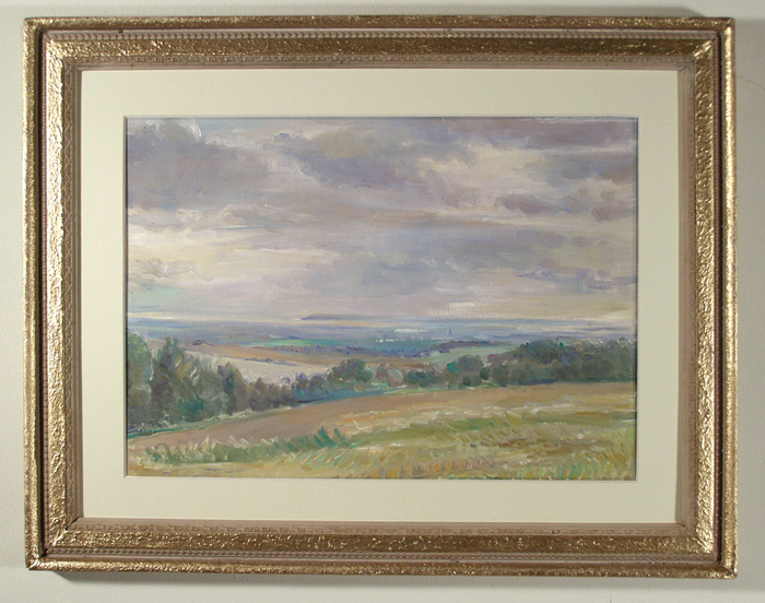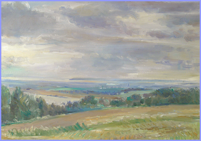 An Impressionist oil by Jeanne Courtald (of Courtauld Institute connection) depicting a view over the South Downs towards Chichester and the Isle of Wight. The spire you can see is Chichester Cathedral, and I think the splash of white to the left is Chichester harbour. Beyond is the Solent and Culver cliff on the Isle of Wight. I am more or less sure this view is from Trundle Hill. The broken cloud cover is highlighting areas of sunlight and shadow on the sea and land. Most likely painted in the 1940`s or 50`s, the painting is unsigned but came from the artists studio sale in Pulborough a few years ago. Jeanne Courtauld lived in the area for many years and loved to paint on the Downs. I certainly can do no better than to Quote from her obituary;