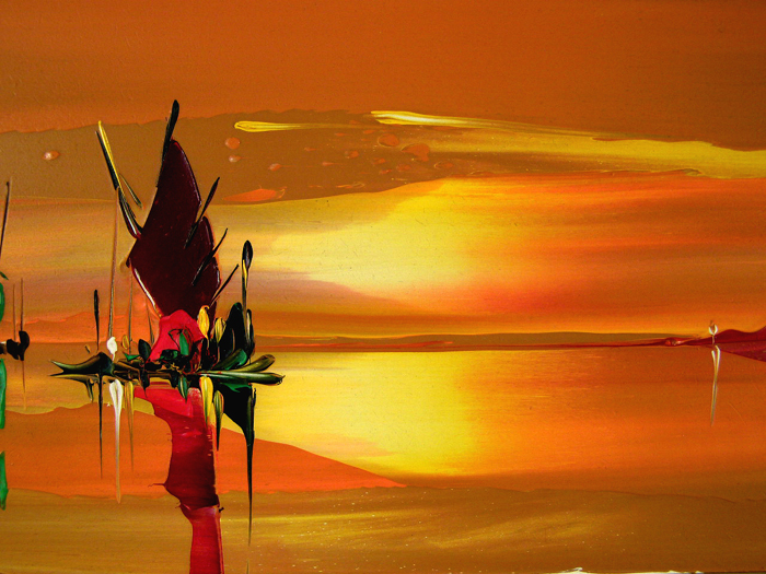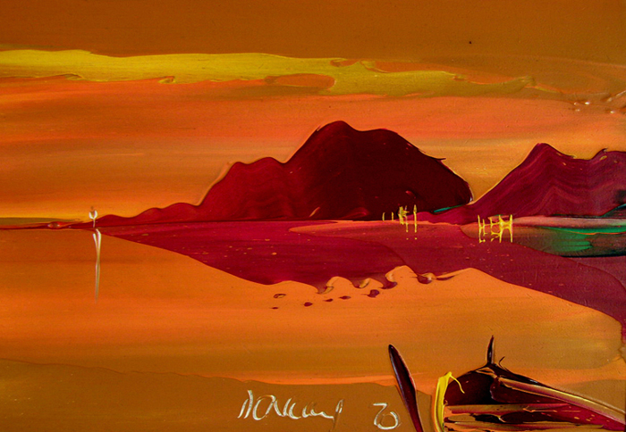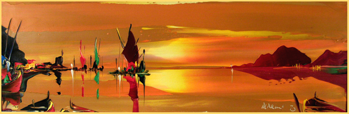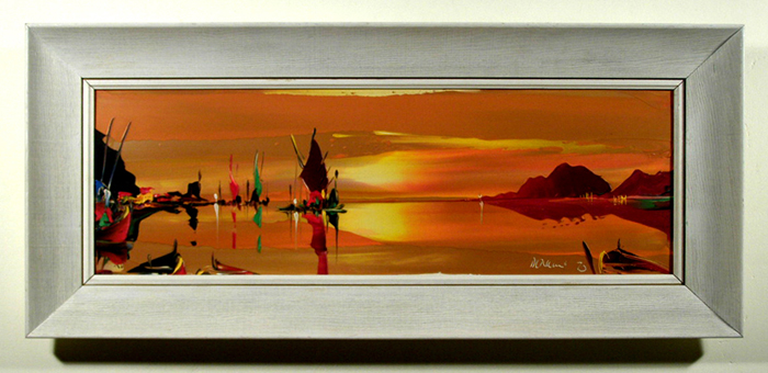 An amazing image by George Deakins depicting a sunset on the China Coast, with Chinese junks lying in the shelter of the offshore islands, near to a coastal village with boats drawn up on the shore. Deakins was an extraordinary painter, and is now becoming much appreciated, especially since the 1960`s and 70`s eras have become fashionably `retro`. This painting with its vivid orange and russet tones is particularly 1970`s era.