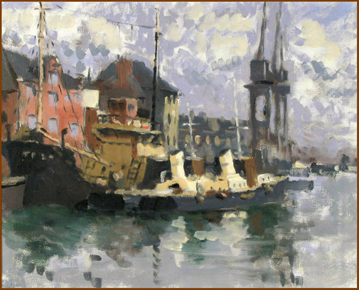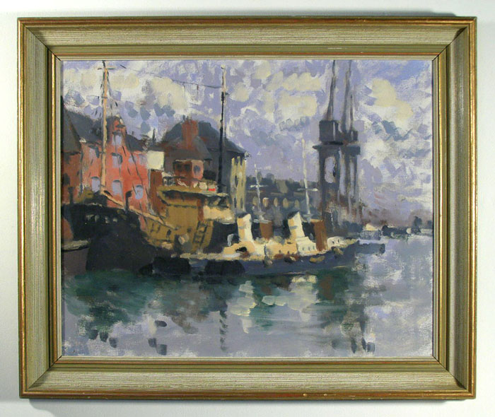 An extremely competent oil depicting tugboats and a cargo vessel alongside a harbour wall. Location is unknown - possibly along the East coast perhaps. Very freely painted in an impressionist manner similar to artists such as Edward Seago working in the 1950`s or 60`s and definitely from that period. Unsigned but canvas and original frame are typical of the period. A fine painting of a good size which will look great in any situation. As the painting is unsigned I can only offer it at a nominal price - absolute bargain
