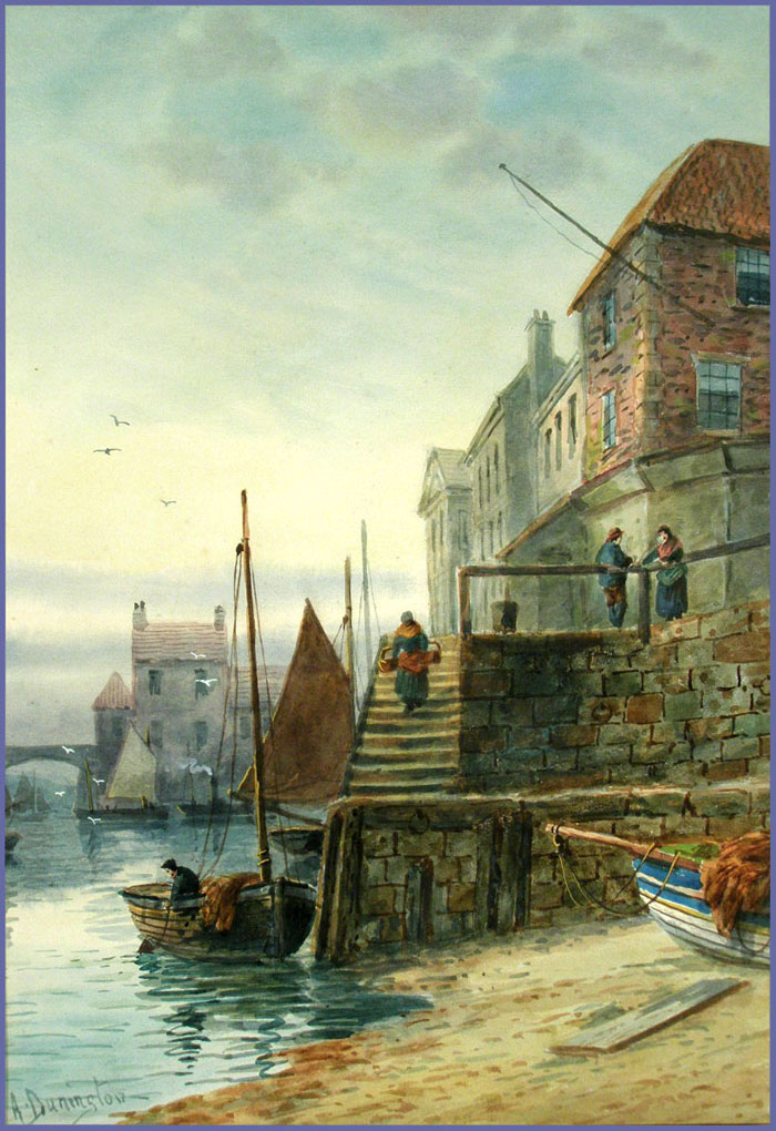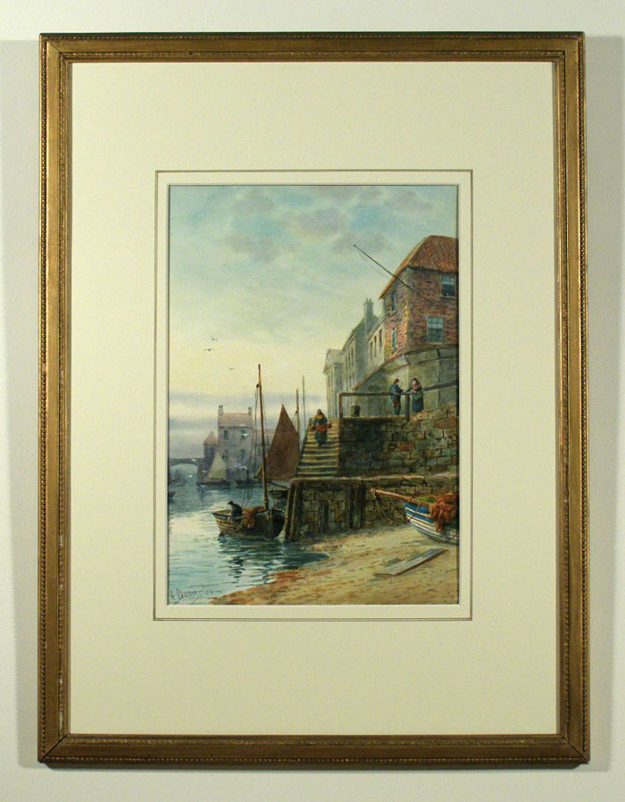 A familiar scene to anyone who knows Whitby. The swing bridge leading to the outer harbour and the sea can be seen in the distance, not so many sailing boats around these days, and a small steamboat can be glimpsed in the distance. Probably painted around 1900, and most of the buildings are still extant. Dunington was originally from Nottingham and would have been familiar with the work of Laura Knight and the Staithes group, an influence on many artists of his generation in style and subject matter. Painting is in its original gilt frame with new gold lined ivory mount.