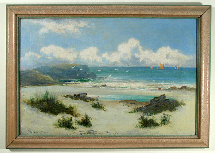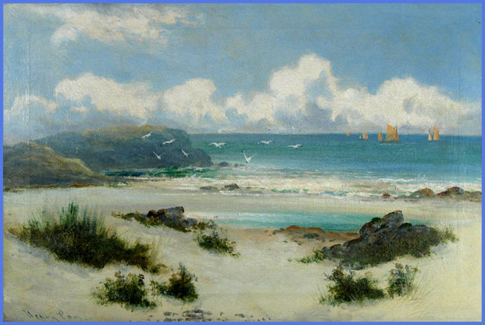 Lovely Art Deco seascape by Henry Cooper , who was a painter of coastal scenes and landscapes , usually in oil. He painted many Devon scenes , as well as highland landscapes and views of South East England in the first quarter of the 20th Century. His work is popular and regularly appears at auction where it achieves good prices. This is a typical sunny scene with the fishing fleet in the background and gulls wheeling overhead. Frame is a very nice 1920`s-1930`s style which suits the painting well and appears to be the original. Colours are good and bright - I think the painting has been cleaned fairly recently. A good size at 27 x 19 inches overall which will look nice anywhere, and I think a good investment for the future.