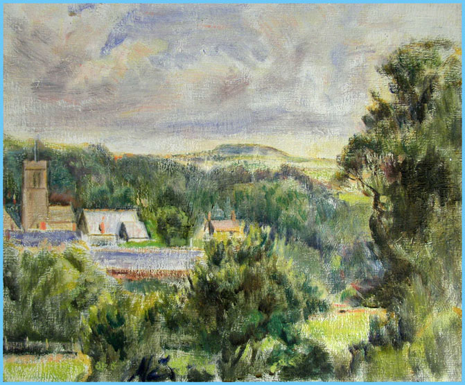 Oil on canvas by Dorset painter John Jowett (1904 - ?) depicting Chideock church and Golden Cap beyond in the far distance. The rocky shoulder of Golden Cap is the highest point on the South Coast and features huge cliffs on the far side (in this instance) fronting on to Lyme Bay. This is one of a small collection of Jowitt paintings featuring scenes around Chideock where he lived for many years. Chideock church has a painting by the artist which can be seen in the tower.