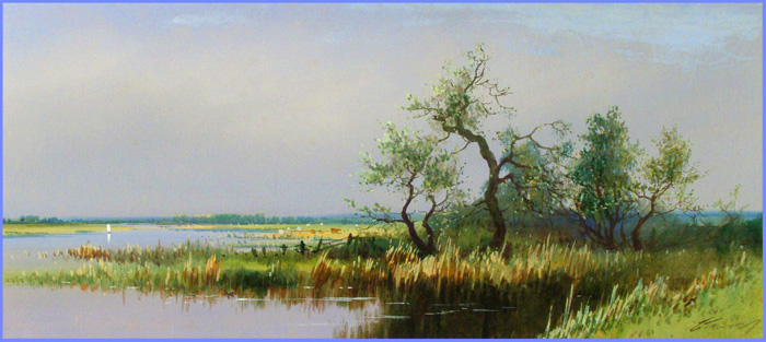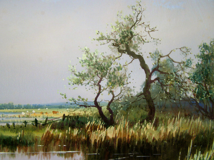 A very large and colourful watercolour by George Trevor depicting a hot and sunny day on Barton Broad. An unusual subject and size for this artist who is mostly known for his paintings of Devon and Cornwall. However the panoramic format and large dimensions perfectly capture the feeling of the Broads on a sunny afternoon. The natural oak frame is the original and suits the painting well, new ivory coloured mount.