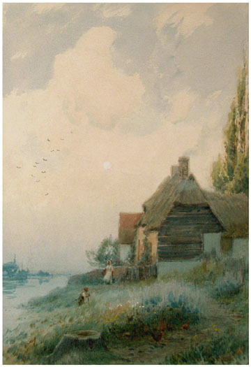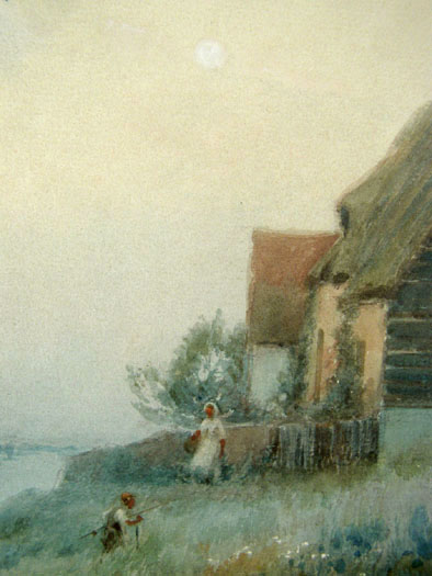 A lovely tranquil and atmospheric work by Charles Wilkinson depicting an evening scene on the fens. A fisherman returns home in the fading light, while his wife waits to greet him. In the distance is a typical fenland landscape, you can just about make out a windmill on the horizon.In the foreground are some chickens rooting around on the pathway. The painting is in its original gilt mount with handwritten title, and housed in a simple gilt frame which suits the painting well. Signed and dated lower right.